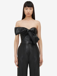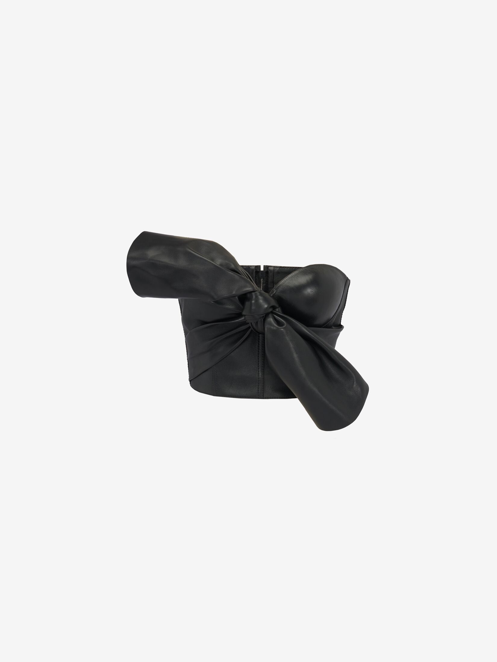 Black soft leather corset top featuring asymmetric bonded bow detailing. The top is finished with a back zip fastening. Product details - Offtheshoulder neckline - Asymmetric drape - Back zip fastening - Product code: 780911Q5AL11000 - Made in Italy