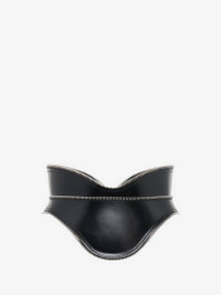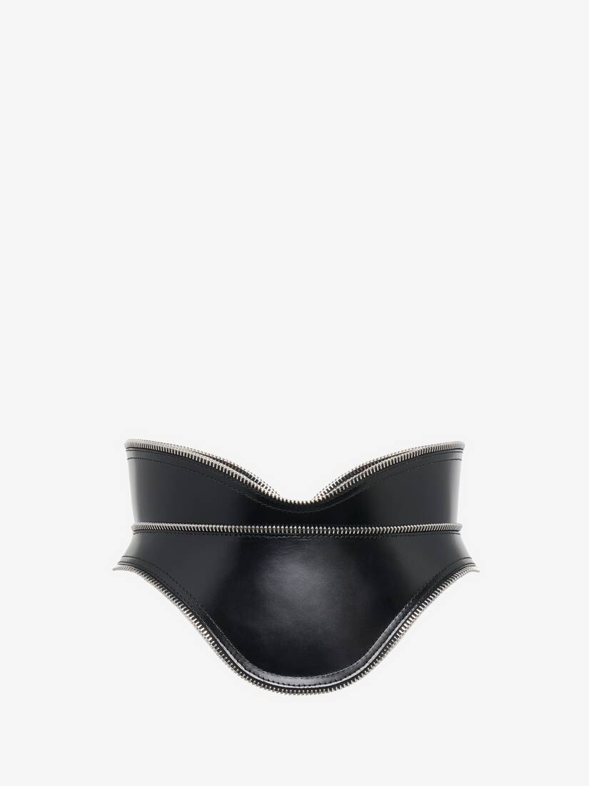 Corset belt in smooth black leather featuring zip teeth detailing and edging. The belt is finished with a back zip fastening. Product Details: • Zip teeth detailing and edging • Back zip fastening • Fits true to size Material:100% Calf Leather Product Code:757995Q5ALE1000