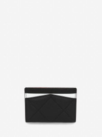 Black quilted nappa leather card holder with white smooth leather trim, featuring a white McQueen Graffiti print and a decorative silver-finished metal skull. Features four credit card slots and one central compartment. Material:100% Calf Leather Product Code:632038C8Z571095