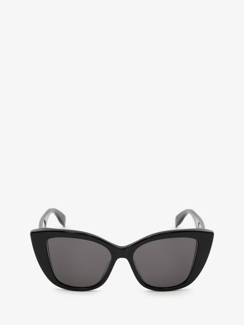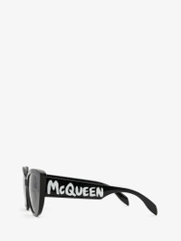 Shiny black acetate sunglasses featuring a cat-eye construction with smoke lenses. Finished with a contrasting white McQueen Graffiti printed signature on one temple only. All Alexander McQueen Eyewear is 100% certified UV protective (UVA and UVB rays). Material:100% Acetate Product Code:689641J07401053