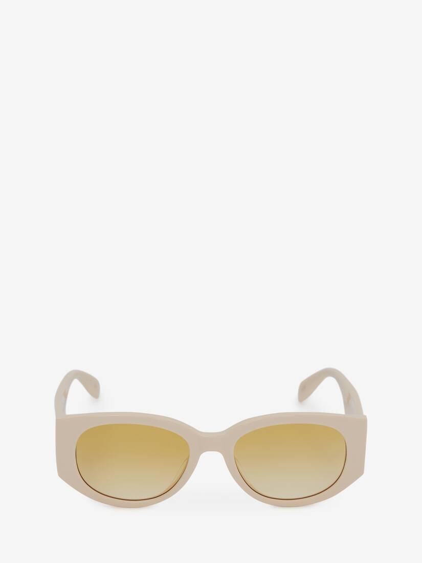 Shiny ivory acetate sunglasses featuring an oval construction with gradient dark yellow lenses. Finished with a contrasting black McQueen Graffiti printed signature on one temple only. All Alexander McQueen Eyewear is 100% certified UV protective (UVA and UVB rays). Material:100% Acetate Product Code:669320J07409125