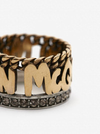 Antique gold-finished triple band ring featuring chain detailing, a cut-out McQueen Graffiti logo and a pave Swarovski crystals band. Eco brass hardware. Available in three sizes. Material:100% Brass Product Code:734763J160T7286