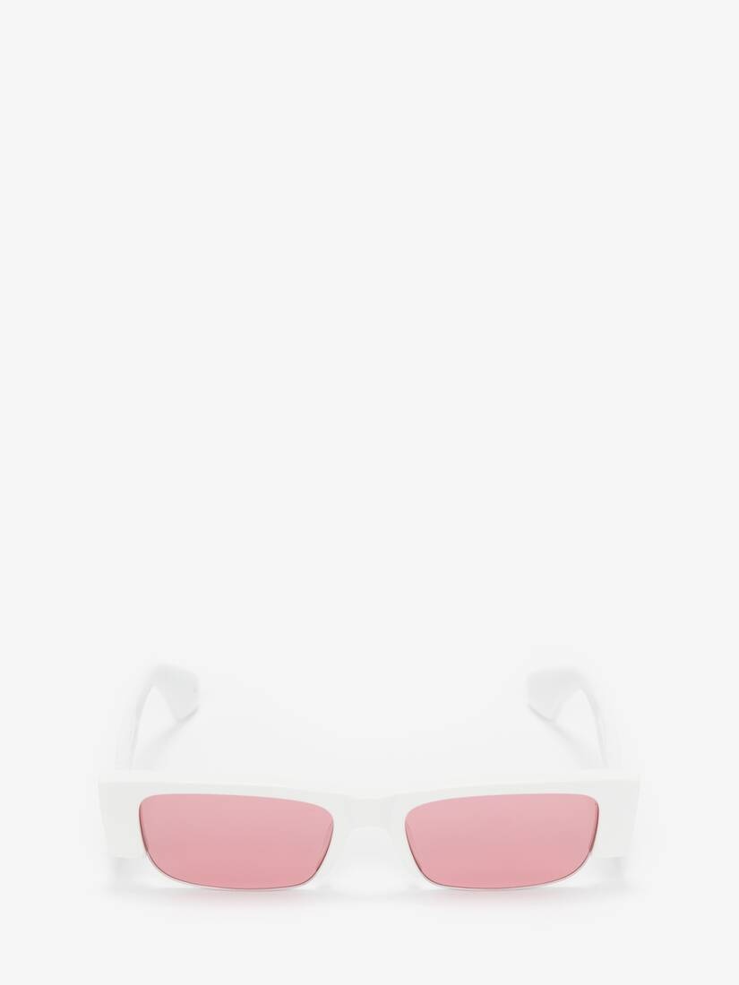 Shiny white acetate sunglasses fitted with solid cyclamen lenses. The sunglasses have a slashed shape with a half-rim frame and are finished with the McQueen Graffiti contrasting logo printed on one temple only. All Alexander McQueen Eyewear is 100% certified UV protective (UVA and UVB rays). Material:100% Plastic Product Code:736850J07499036