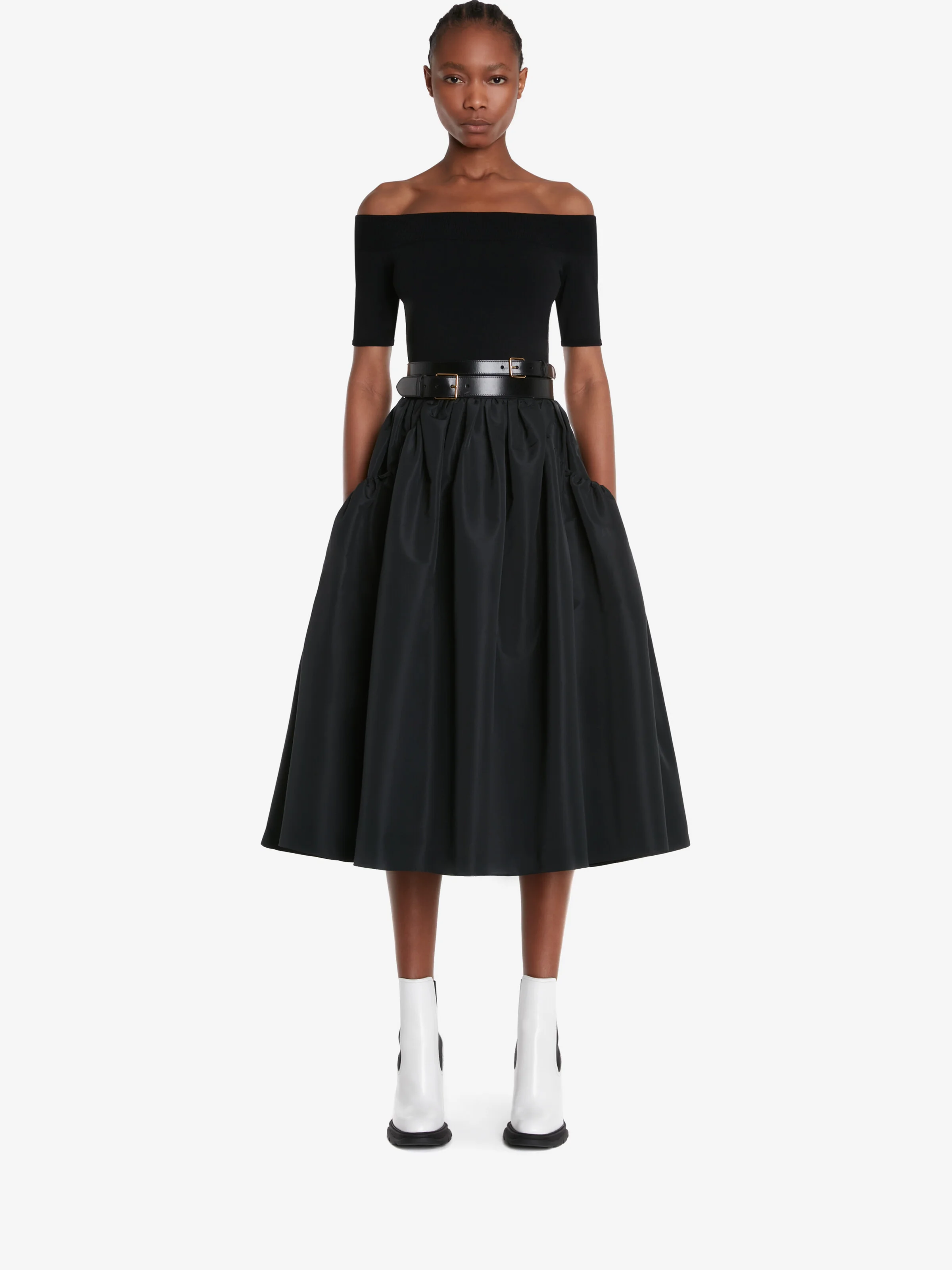 Black stretch viscose knit off-the-shoulder top with a ribbed neckline. Product details - True to size - Product code: 669510Q1AV41000 - Made in Italy - Material: 83% Viscose, 17% Polyester