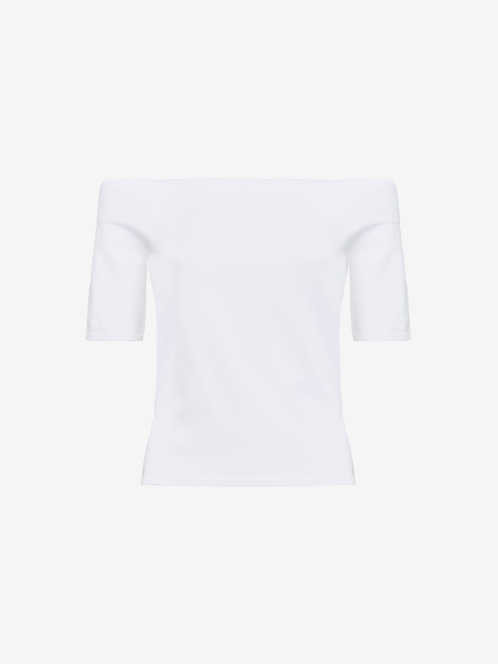 Off-the-shoulder knit top in white stretch viscose. The top features a ribbed neckline and short sleeves. Product details - Ribbed detailing - Short sleeves - True to size - Contains certified viscose yarn - Product code: 669510Q1AV49026 - Made in Italy