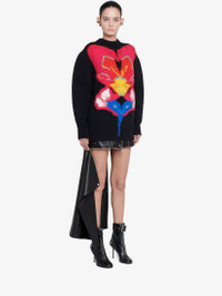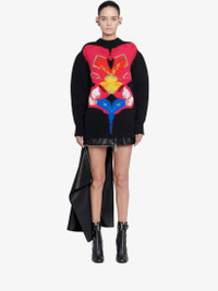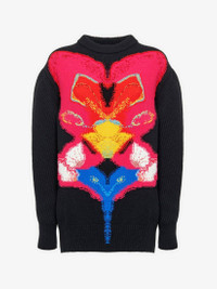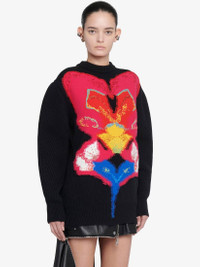 Oversized cocoon sleeve knit jumper in black plain jersey knit featuring a multicoloured Orchid intarsia finished with a 9-colour thread embroidery. The back and the sleeves of the jumper are made in an English knit rib technique creating the sculptural silhouette. Product Details: • Crew neck • Cocoon sleeves • 9-colour thread embroidery • Relaxed fit Material:100% Wool Product Code:758350Q1A6H1160