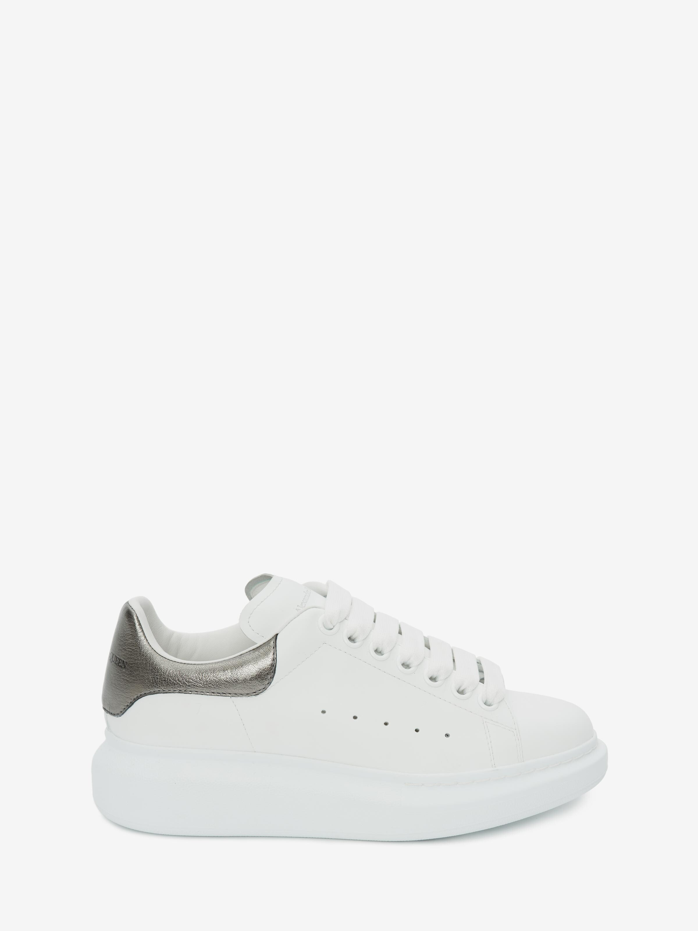 White smooth calf leather lace-up sneaker trimmed with metallic heel detail. The sneaker features large flat laces and an oversized rubber sole. Finished with an Alexander McQueen signature on the heel counter and leather tongue. The sneakers come with an additional lace set. To lessen our environmental impact and to reduce cotton consumption, we will no longer be providing a dust bag with our sneakers. Product details - The style fits true to size - Product code: 553770WHFBU9042 - Made in Italy - Material: 100% Calfskin