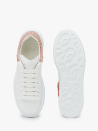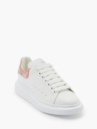 Presented in white calf leather, this Oversized Sneaker features a clay suede and crystal embellished heel counter. The sneaker is finished with the Alexander McQueen signature and a chunky rubber sole. Product details - Round toe - Alexander McQueen signature - Contrasting suede heel counter - Oversized rubber sole - Additional pair of shoelaces included - To lessen our environmental impact and to reduce cotton consumption, we will no longer be providing a dust bag with our sneakers. - Product code: 718243WIEEE8742 - Made in Italy
