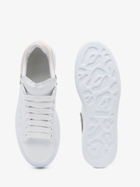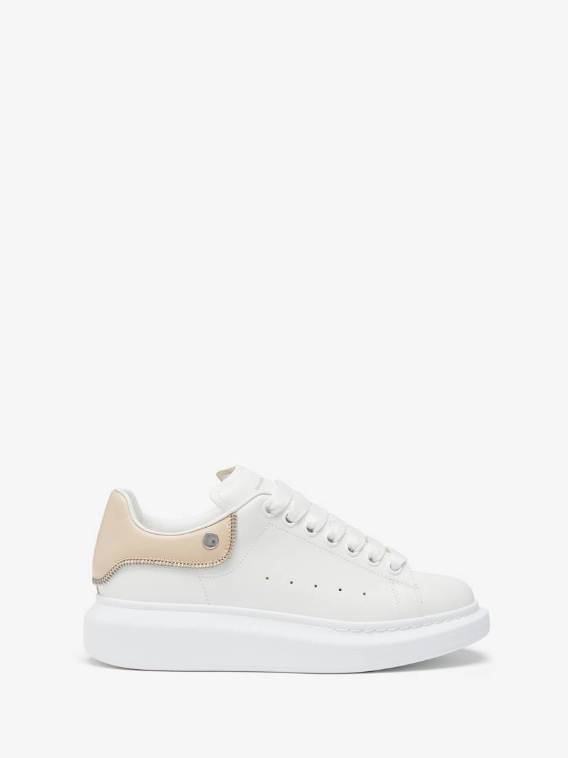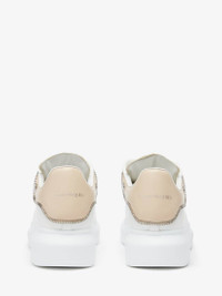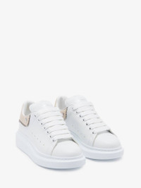 Oversized sneakers in white calfskin with an oat heel counter with silver zip and stud detailing. This model is enhanced with the Alexander McQueen signature and a thick rubber sole. Product details - Round toe - Alexander McQueen signature - Contrasting heel counter - Oversized rubber sole - Additional pair of shoelaces included - Product code: 769116WIEE18780 - Made in Italy