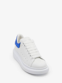 Presented in white calf leather, this Oversized Sneaker is detailed with an ultramarine suede and crystal-embellished heel counter. The sneaker is finished with the Alexander McQueen signature and a oversized rubber sole. Product Details: • Round toe • Alexander McQueen signature • Contrasting suede heel counter • Oversized rubber sole • Additional pair of shoelaces included • To lessen our environmental impact and to reduce cotton consumption, we will no longer be providing a dust bag with our sneakers. Material:100% Calf Leather Product Code:718243WIE999407