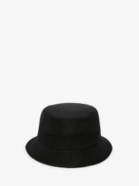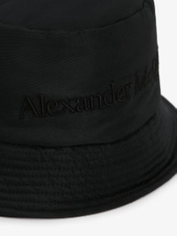 Black bucket hat featuring an embroidered Alexander McQueen signature. Lightly padded style. Finished with tonal topstitching and embroidered eyelets on each side. Material:100% Polyester Product Code:7191343404Q1000