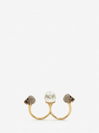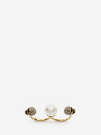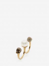 Antique gold-finished double ring detailed with two pave Swarovski crystals skulls and white pearl-like Swarovski. Eco brass hardware. Available in three sizes. Material:100% Brass Product Code:734749I170A2375