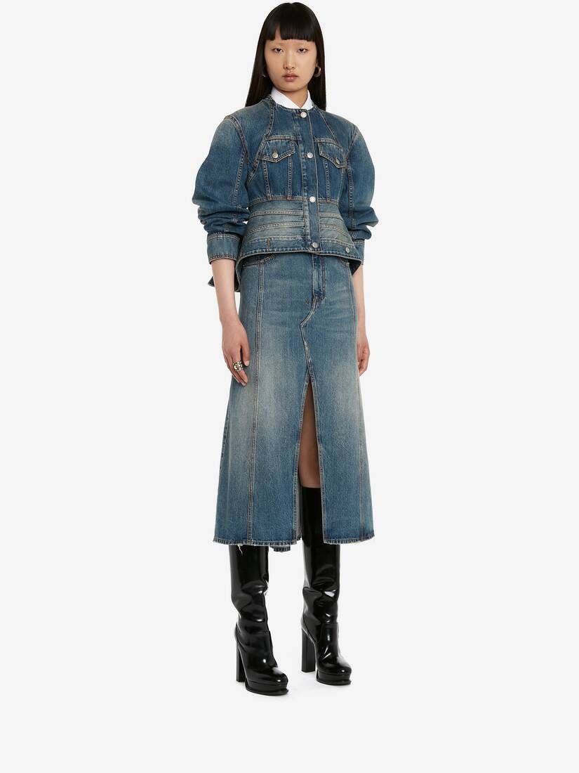 Blue washed denim peplum jacket featuring a crew neck, two flap pockets and harness detailing. The extended belt loops have been stitched down to create a 3-D corset effect. Finished with a front button fastening. Product Details: • Made with organic cotton yarn Material:100% Cotton Product Code:726572QMACC4251