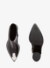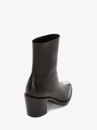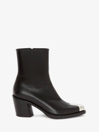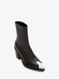 Black leather boot featuring a silver-tone metal toe cap with exaggerated pointed toe silhouette. Finished with a side zip fastening and a cuban heel. Product Details: - Heel height: 70mm Material:100% Calf leather Product Code:709986WIDY11081