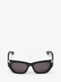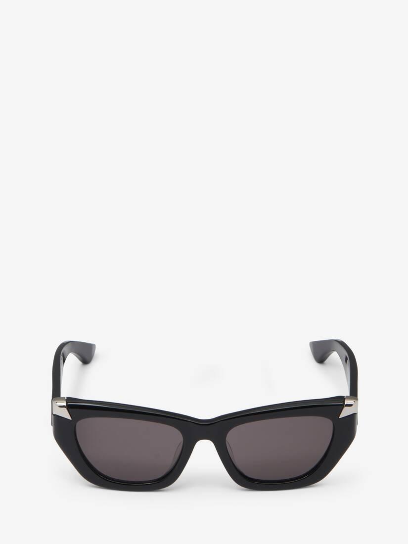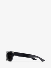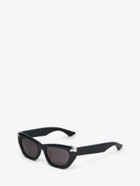 Black sunglasses fitted with solid smoke lenses. The sunglasses have a geometric shape and are detailed with two silver metal rivets on the front. Finished with a tonal lasered Alexander McQueen signature on the temples. All Alexander McQueen Eyewear is 100% certified UV protective (UVA and UVB rays). This frame can be fitted with prescription lenses. Product details - Product code: 781194J07491056 - Made in Italy - Material: Acetate