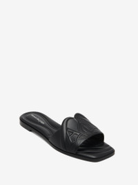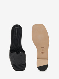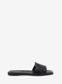 Flat slide sandal in black leather featuring an exploded embossed Seal Logo on the upper. The sandal is finished with a printed Alexander McQueen logo on the insole. Product details - Square toe - Leather sole - Heel height: 5mm - Product code: 780714WIEAD1000 - Made in Italy