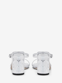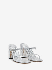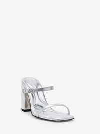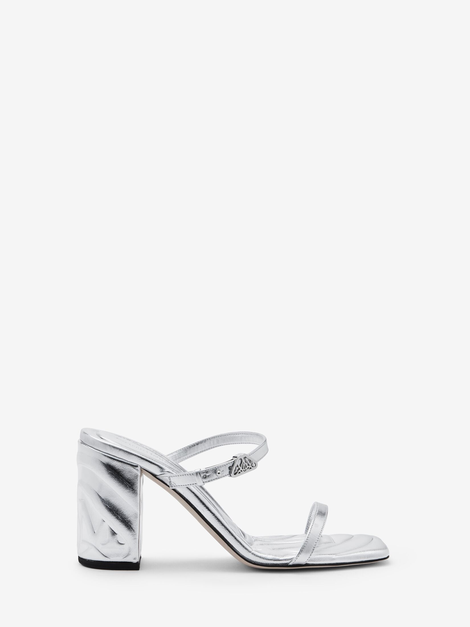 Metallic silver leather mule with two thin straps and a mini silver-finished Seal Logo buckle. The silhouette features an embossed Seal Logo that wraps around the block heel. Product details - Square toe - Silverfinished hardware - Leather sole - Heel height: 85mm - Product code: 780711WIF118100 - Made in Italy