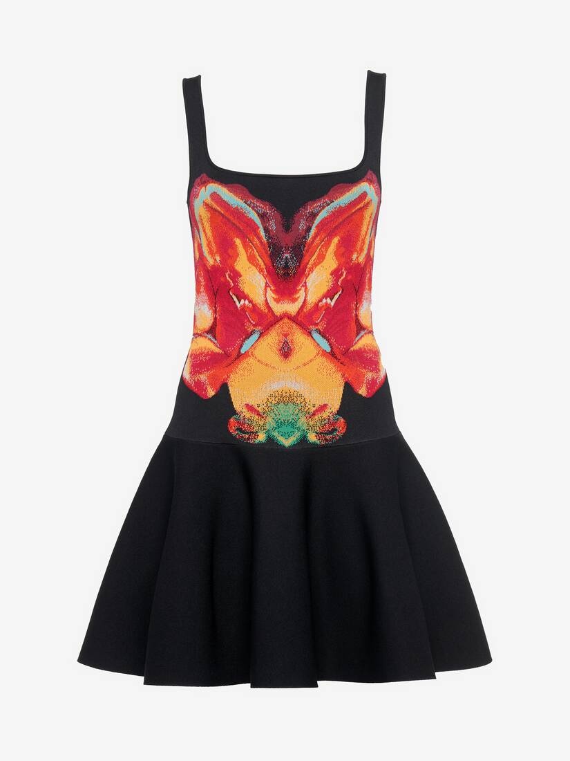 Black-multicoloured Solarised Orchid jacquard knit mini dress. The dress features a square neckline and a flared skirt. Product Details: • Square neckline • Mini length • Flared skirt • Fits true to size • Contains certified viscose yarn Material:83% Viscose, 17% Polyester Product Code:758519Q1A6G1160