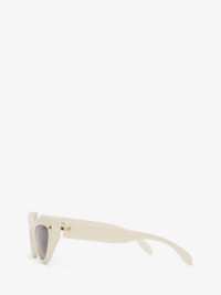 Shiny ivory acetate sunglasses fitted with solid smoke lenses. The sunglasses have a cat-eye shape and are detailed with two ligt gold metal spike studs on both the front and the temples. Finished with a tonal lasered Alexander McQueen signature. All Alexander McQueen Eyewear is 100% certified UV protective (UVA and UVB rays). Material:100% Plastic Product Code:736854J07499134