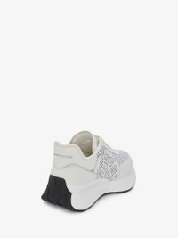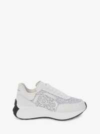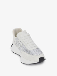 Sprint Runner with a pieced and patched upper silhouette in white leather and glitter underlay with sport mesh featuring an applique Seal logo on the side and an Alexander McQueen signature on the heel counter. The sneaker features an oversized runner sole with a black outsole, large flat laces, a padded heel counter and tongue with an Alexander McQueen signature. Comes with an additional set of shoelaces. To lessen our environmental impact and to reduce cotton consumption, we will no longer be providing a dust bag with our sneakers.