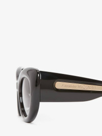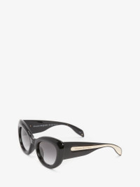 Shiny black bio injection sunglasses fitted with gradient grey lenses. The sunglasses have a cat-eye shape and are enriched by a contrasting light gold metal insert on the temples, with a lasered Alexander McQueen signature. All Alexander McQueen Eyewear is 100% certified UV protective (UVA and UVB rays). Material:100% Plastic Product Code:736856J07521053