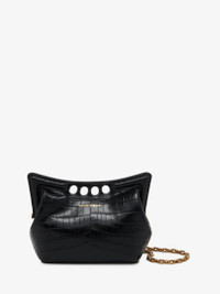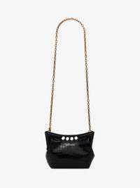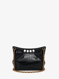 Inspired by the sharp and structured shoulders of the tailoring silhouettes, this mini Peak bag combines a curve-shaped magnetic frame with a soft body. The bag is handcrafted from a black croc-effect innovative new vegan material combining quality and durability. The Peak bag can be worn either over the shoulder or across the body using its antique gold-finished chain strap. Product details - Dimensions: Length 22.5 x Height 16 x Depth 9 cm / 8.8 x 6.2 x 3.5 inches - Strap drop: 55cm / 21.6 inches - Magnetic fastening - Fixed chain strap - Brass hardware with antique gold finishing - Contrasting suede-effect lining - Product code: 7899481MCAA1000 - Made in Italy - Material: Viscose, Wool, Thermoplastic Polyurethane