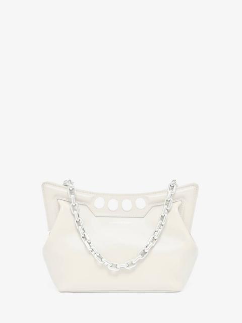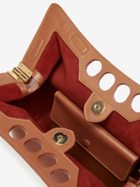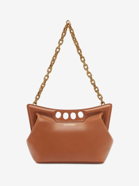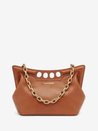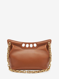 Inspired by the sharp and structured shoulders of the tailoring silhouettes, this small Peak bag is handcrafted from tan calfskin leather with a curve-shaped magnetic frame, juxtaposed with a soft body. The bag can be worn over the shoulder using its antique gold-finished chain strap or hand-held by the four-ring handle. Product details - Dimensions: Length 28 x Height 20 x Depth 11cm / 11 x 7.8 x 4.3 inches - Strap drop: 30cm / 11.8 inches - Magnetic fastening - Fixed chain strap - Brass hardware with antique gold finishing - Contrasting suede lining - Product code: 7430911BLGN2417 - Made in Italy