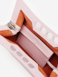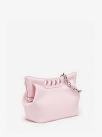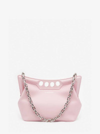 Inspired by the sharp and structured shoulders of the tailoring silhouettes, this small Peak bag is handcrafted from light pink calfskin leather with a curve-shaped magnetic frame, juxtaposed with a soft body. The bag can be worn over the shoulder using its antique silver-finished chain strap or hand-held by the four-ring handle. Product Details: • Dimensions: 28 x 20 x 11 cm / 11 x 7.8 x 4.3 inches • Strap drop: 30 cm / 11.8 inches • Magnetic fastening • Fixed chain strap • Brass hardware with antique silver finishing • Contrasting suede lining Material:100% Calf Leather Product Code:7430911BLGG5723