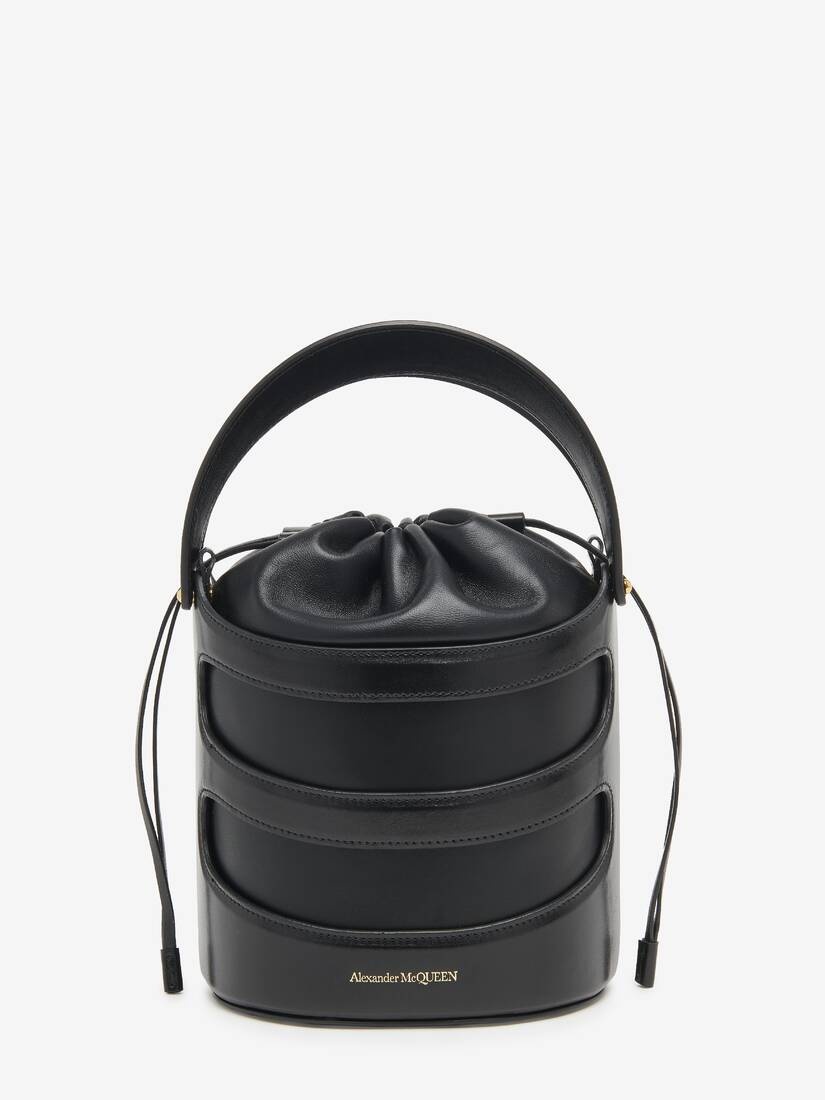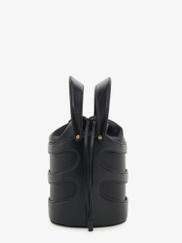 Black calfskin leather Rise Bucket featuring a structured harness-like cage and a black soft nappa pouch. The bag can be worn either hand-held with the leather handles or cross the body, using the adjustable and detachable leather strap. Product details - Dimensions: Length 16 x Height 18 x Depth 14.5cm / 6.2 x 7 x 5.7 inches - Strap drop: 35-55cm / 13.7-21.6 inches - Drawstring fastening - Brass hardware with gold finishing - One main compartment - Lambskin leather lining - Detachable and adjustable strap - Product code: 7871261VPGI1000 - Made in Italy
