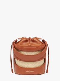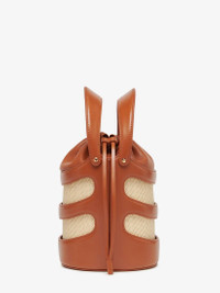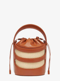 Tan calfskin leather Rise Bucket featuring a structured harness-like cage and a natural raffia pouch. The bag can be worn either hand-held with the leather handles up or across the body, using the adjustable and detachable leather strap. Product details - Dimensions: Length 16 x Height 18 x Depth 14.5cm / 6.2 x 7 x 5.7 inches - Strap drop: 35-55cm / 13.7-21.6 inches - Drawstring fastening - Brass hardware with gold finishing - One main compartment - Detachable and adjustable strap - Product code: 7871261VPIO2050 - Made in Italy - Material: Calfskin