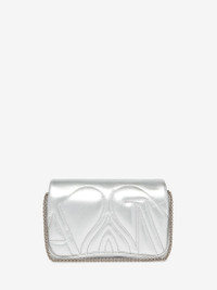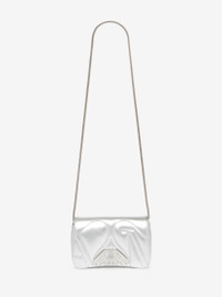 Silver metallic Mini Seal bag handcrafted from padded lambskin leather, featuring an exploded Seal Logo and a silver-finished cut-out metal Seal closure. The Mini Seal bag plays with curves and rounded edges. This bag can be worn across the body using its woven metal chain strap. Alternatively, it can be worn over the shoulder by doubling the chain strap or hand-held by removing the detachable chain strap. Product details - Dimensions: Length 22 x Height 13 x Depth 5 cm / 8.6 x 5.1 x 1.9 inches - Chain strap drop: 23-55 cm / 9-21.6 inches - Metal Seal fastening - One main compartment and a flat pocket - Tonal leather lining - Detachable silver-finished chain strap - Product code: 7770111BL0I1400 - Made in Italy