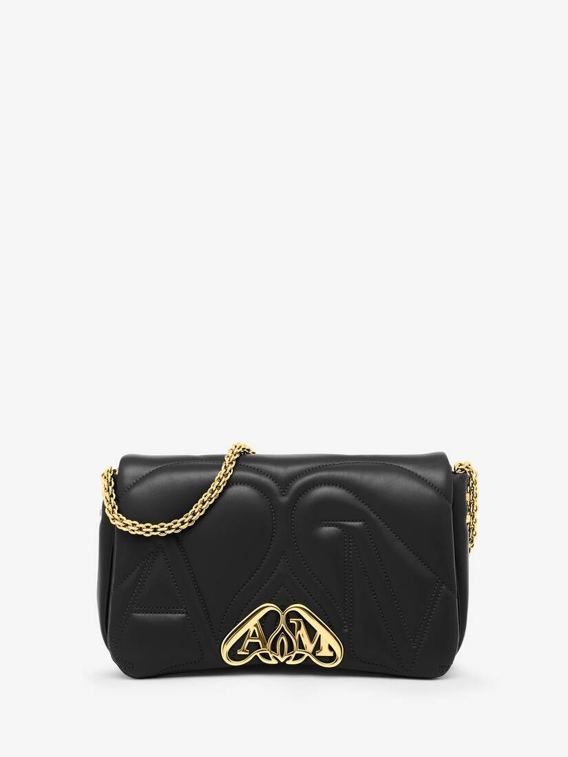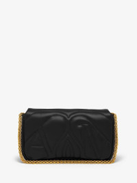 Black Small Seal bag handcrafted from padded lambskin leather, featuring an exploded Seal logo and gold-finished cut out metal Seal closure. The Small Seal bag plays with curves and rounded edges. This bag can be worn over the shoulder with its woven metal chain strap. Alternatively, it can be worn cross the body with its adjustable leather strap. Both straps are detachable. Product Details: • Dimensions: 28 x 16 x 6 cm / 11 x 6.2 x 2.3 inches • Cross the body adjustable leather strap drop: 55cm / 21.6 inches • Chain shoulder strap drop: 25 cm / 9.8 inches • Both straps are detachable • Metal Seal fastening • One main compartment • Tonal leather lining • Antique gold-finished chain and leather strap Material:100% Lambskin Product Code:7573751BLE11000