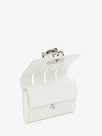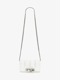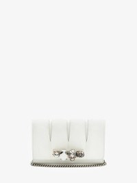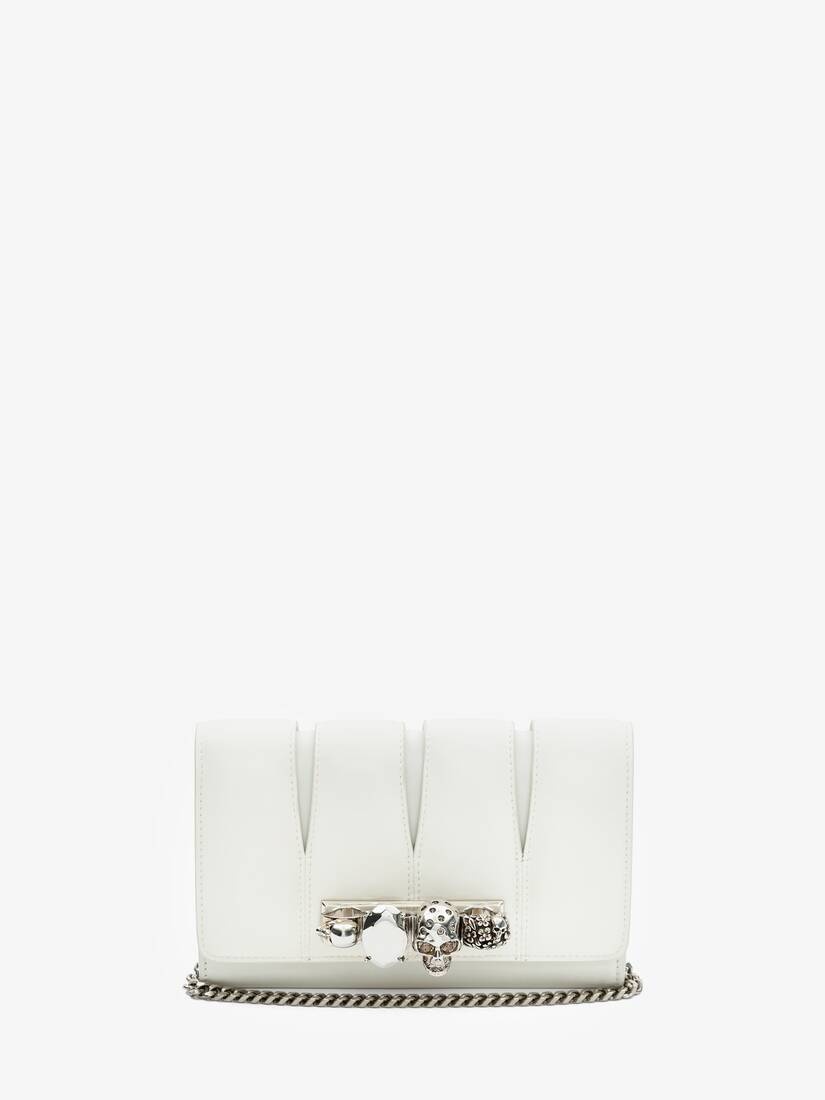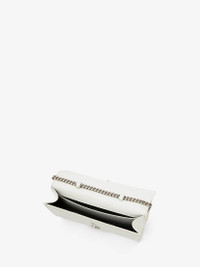 The Slash clutch bag in soft ivory leather. The outside flap features cut-out details inspired by the silhouettes of the tailoring and is handcrafted from soft lambskin leather. The body of the bag and the second flap, which closes with a press stud, are handcrafted from calfskin leather. Finished with a handle adorned with Swarovski-encrusted rings. The bag can be worn in multiple ways: over the shoulder or across the body using the chain strap or hand-held as a clutch by removing the strap. Product Details: • Dimensions: 20 x 1.,5 x 3.5cm / 7.8 x 5 x 1.3 inches • Strap drop: 52cm / 20.4 inches • Silver-finished four ring adornment encrusted with Swarovski crystals • Magnetic press-stud fastening • Flat zip pocket and card slot • Antique silver detachable crossbody chain strap • Brass hardware with antique silver finishing • Contrast nappa lining • Accommodates smartphones • Due to the appearance of the product, we recommend stowing it in your hold luggage when passing through airport security. For the same reason we recommend not taking the bag to public places, such as law courts and sports stadiums, where there may be security checks Material:70% Calf Leather, 30% Lambskin Product Code:732795DYTCB9210