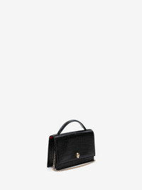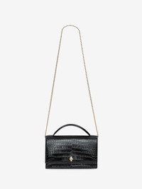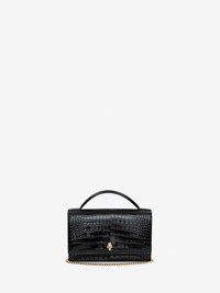 Shiny black embossed croc calfskin leather Skull Bag detailed with a gold-finished skull and a leather top handle. The bag can be worn either hand-held with its removable chain strap or over the shoulder by doubling up the chain or cross the body. Product details - Dimensions: 24 x 14 x 6.5cm / 9.4 x 5.5 x 2.5 inches - Strap drop: 55cm / 21.6 inches - Magnetic closure - One central compartment and one card slot - One external back pocket - Removable crossbody chain strap - Suede-effect lining - Gold-finished chain strap - Can accommodate a smartphone - Product code: 7327981HB0G1000 - Made in Italy - Material: Calf Leather
