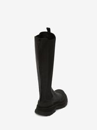 Black calf leather knee-high Chelsea style boot with an oversized rubber tread sole. The boot is detailed with a textured rubber wrap and tonal Alexander McQueen signature, finished with a leather pull tab on the front of boot. Round-toe boot silhouette with rubber toe cap detail. Product details - The style fits true to size - Product code: 707682WHZ661000 - Made in Italy - Material: 100% Calf Leather