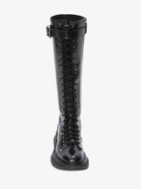Black shiny calfskin leather lace-up boot with a thick oversized rubber tread sole. Knee high boot silhouette with buckle detailing and a round toe shape. Finished with a side zip fastening. Product details - The style fits true to size - Product code: 595466WIDU21081 - Made in Italy - Material: Calf Leather