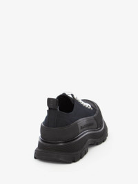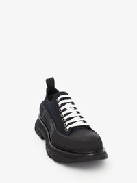 Black canvas lace-up with a lightweight oversized rubber tread sole. The lace up is detailed with a textured rubber wrap and tonal Alexander McQueen signature, finished with a signature ribbon on the heel of shoe. Round toe shape silhoutte details rubber toe cap.