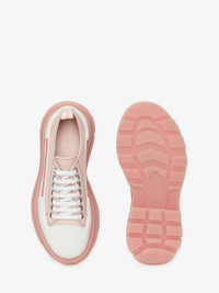 Tea rose calf leather lace-up with a tonal transparent lightweight oversized rubber tread sole. The lace-up is detailed with a textured rubber wrap and tonal Alexander McQueen signature, finished with a signature ribbon on the back of boot. Round toe shape boot silhouette and rubber toe cap. Comes with white and tea rose laces. Material:100% Calf leather Product Code:702042WHZ6D6898