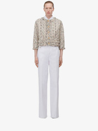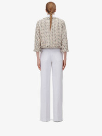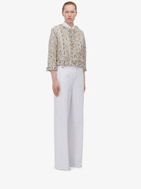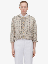 Boxy jacket in multicoloured summer tweed featuring a crew neck and frayed trims along the edges. The jacket is finished with gold metal knot buttons. Product Details: • Crew neck • Three-quarter sleeves • Button fastening Material:69% Cotton, 22% Polyester, 7% Polyamide, 1% Metallic Polyester, 1% Viscose Product Code:778382QEAE79101
