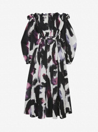 White and multicoloured cotton poplin off-the-shoulder dress with an all-over Watercolour Graffiti print. Features cocoon sleeves. Finished with a back zip fastening. Product Details: • Made with organic cotton yarn Material:100% Cotton Product Code:734098QCAGO9903