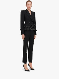 Long cigarette trousers in black grain de poudre with zip detailing on the front. The trousers feature a high waist, two side pockets and a jetted pocket on the back. Finished with a concealed zip and hook fastening. Product Details: • High waist • Side pockets • Zip detailing on the front • Concealed zip and hook fastening • Made with organic wool yarn Material:100% Wool Product Code:757361QJAAC1000