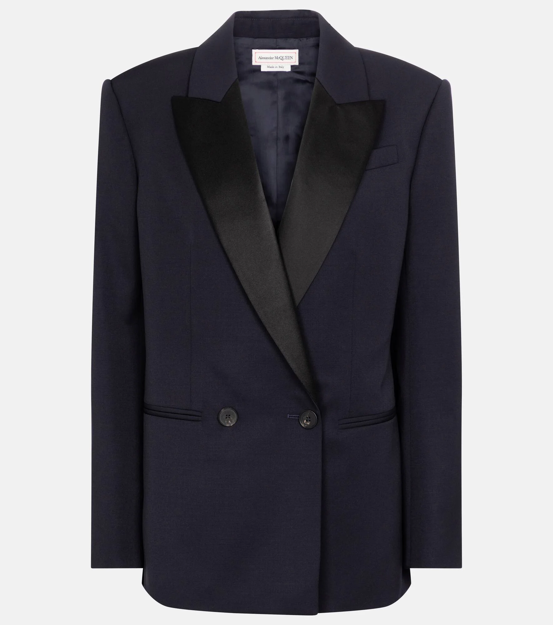 Reinterpreting menswear tailoring silhouettes for the modern woman is an Alexander McQueen specialty, and this navy blazer from the Pre-Fall '21 collection is a case in point. Made in Italy from wool, it has a boxy silhouette with padded shoulders that accentuate the frame, and is finished with black satin lapels. - material: 100% wool - details: 77% silk, 23% polyester - lining: 100% cupro, fully lined - care instructions: dry clean - slit pockets, breast pocket - button fastening - Made in Italy - buttoned cuffs - shoulder pads - Designer colour name: Navy - contains non-textile parts of animal origin