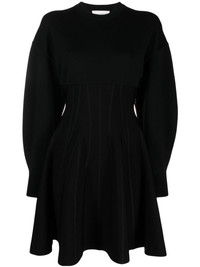wool-blend flared minidress This minidress captures Alexander McQueen’s penchant for dark palettes and dynamic shapes. It’s spun from a black wool blend to a structured silhouette enhanced with a flared skirt. Highlights - Black - Wool blend - Pleat detailing - Flared design - Round neck - Drop shoulder - Long sleeves - Straight hem Made in Italy Composition Wool 82%, Polyamide 17%, Elastane 1% SIZE & FIT Model measurements Height 5 ft 11 in(1.8 m) Bust/Chest 34.25 in(87 cm) Hips 35.82 in(91 cm) Waist 24.8 in(63 cm) Measurement SLEEVE LENGTH 20.98 in(53.3 cm) HIPS 40 in(101.6 cm) LENGTH 32.99 in(83.8 cm) WAIST 25.98 in(66 cm) BUST 34.01 in(86.4 cm) FittingInformation Designed for a close fit at the chest and waist with a loose fit at the hip Made from a midweight stretch fabric, this piece offers elasticity and flexibility when worn This piece fits true to size – take your usual size