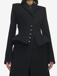 Single-breasted coat in black double wool cashmere. Notched lapels, fitted waist and corset detailing. Finished with a T-Bar chain back detail. Product details - Notched lapels - Chest pocket - Hook fastening - Product code: 842792QKABR1000 - Made in ITALY - Material: 50% Wool, 50% Cashmere
