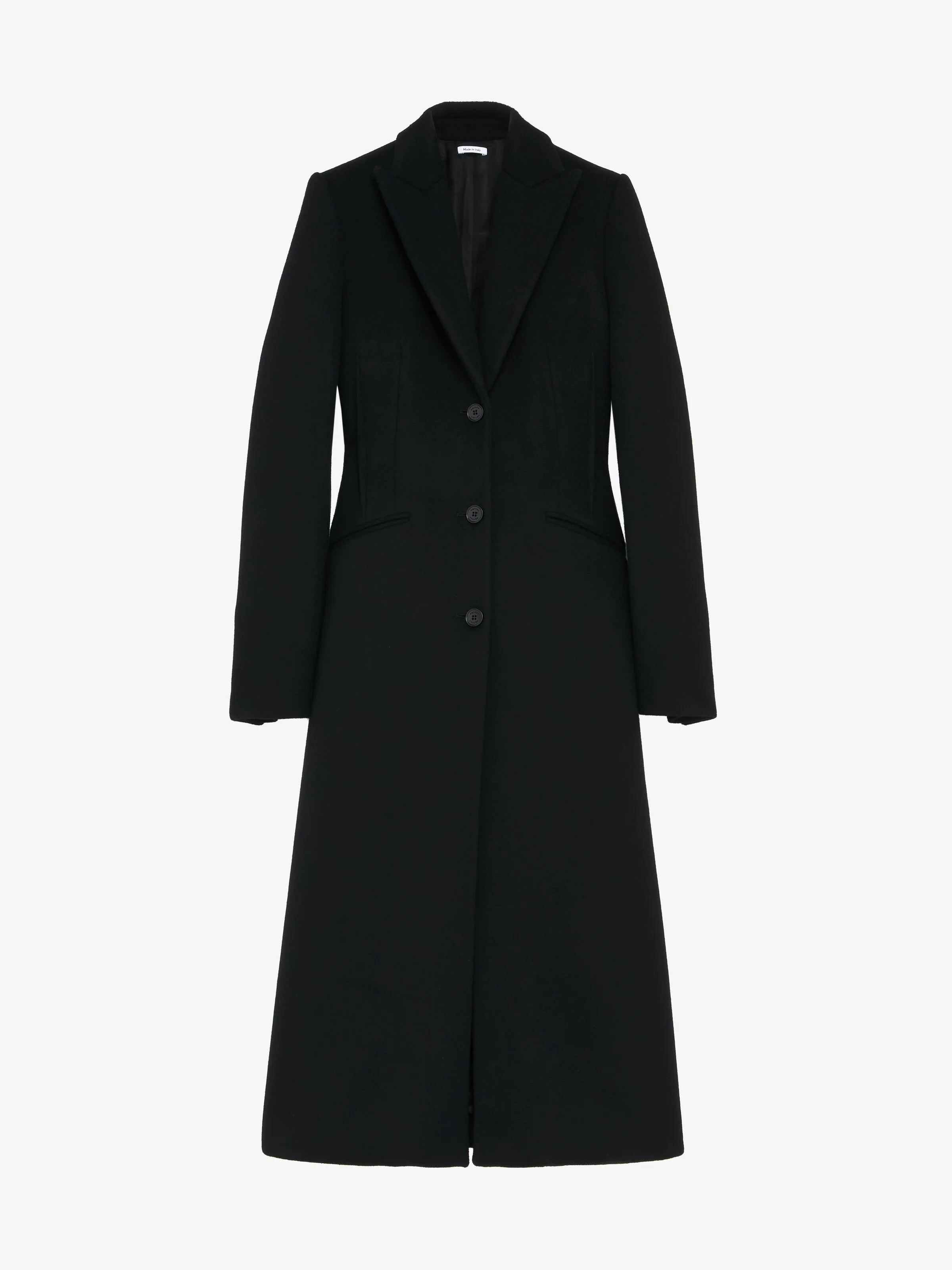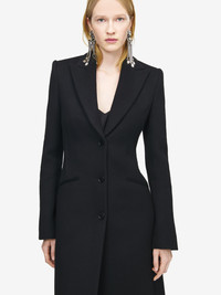 Single-breasted coat in black wool barathea. Peak lapels, side jetted pockets and dart detailing. Finished with a front button fastening. Product details - Peak lapels - Side jetted pockets - Button fastening - Made with certified wool yarn - Product code: 857481QKABM1000 - Made in ITALY - Material: 100% Wool
