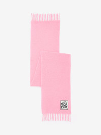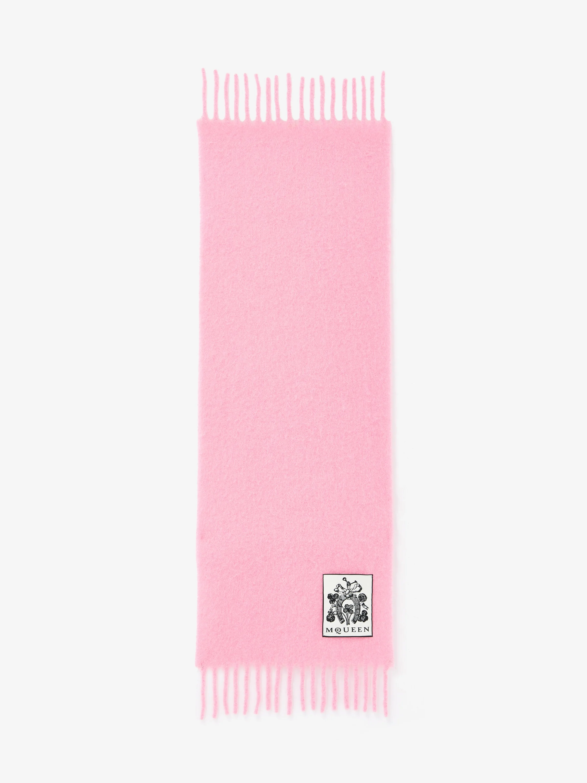 Solid cozy scarf in a cocktail pink alpaca wool blend with a soft hand feel. The scarf features a contrasting patch with a floral print and the McQueen logo. Finished with fringe detailing. Product details - Dimensions: 35 x 220 cm / 13.7 x 86.6 inches - Product code: 8357073E78Q5900 - Made in ITALY - Material: 80% Alpaca Wool, 20% Polyamide