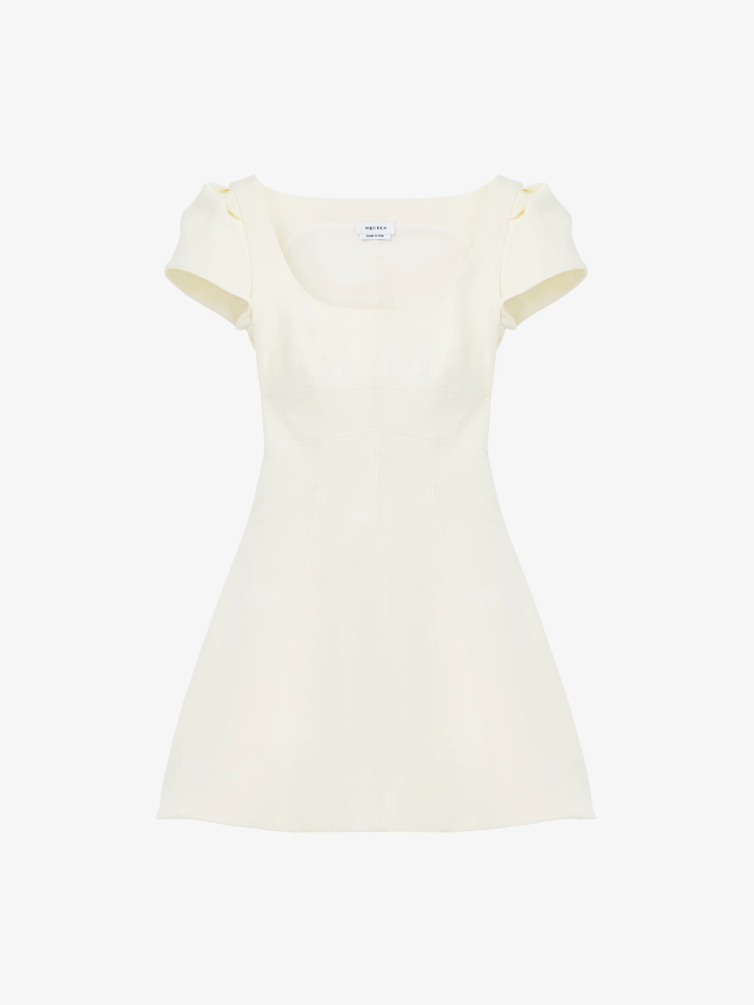 Mini dress in light ivory wool silk. Square neck, short gathered sleeves and corset-inspired stitch detailing. Product details - Square neck - Short sleeves - Product code: 841216QJAAA9007 - Made in Italy - Material: 63% Wool, 25% Silk, 12% Polyamide
