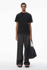 short-sleeve acid wash high twist jersey tee with repeating logo print at hem - ribbed trim at neck - relaxed fit - hits at hip - 100% cotton - model is 6'2" and wears size m - made in china - UCC2221527007 composition Body/Exterieur: 100%COTTON Rib 1/Tricot Cotele: 100%COTTON