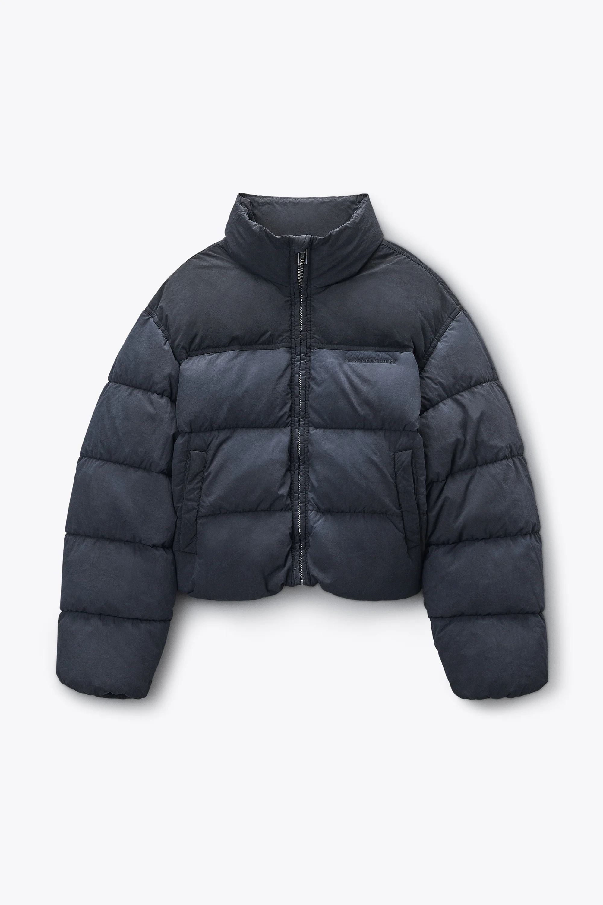 cut from washed graphite matte nylon, this cropped puffer jacket features a stand collar, dropped shoulders, and a zip-front closure with a bungee cord hem. snap welt pockets, tonal logo embroidery, and a contrast yoke panel complete the look. - long sleeves - stand collar - front-zip closure with guard - welt pockets with snap closure - body composition: 100% polyamide - model is 5'11" and wears a size s - made in China - 1WC4253303099A composition Body: 100%POLYAMIDE Body 2: 100%POLYAMIDE Lining: 100%NYLON Filling: 75%DOWN/25%FEATHER Filling 2: 100%POLYESTER