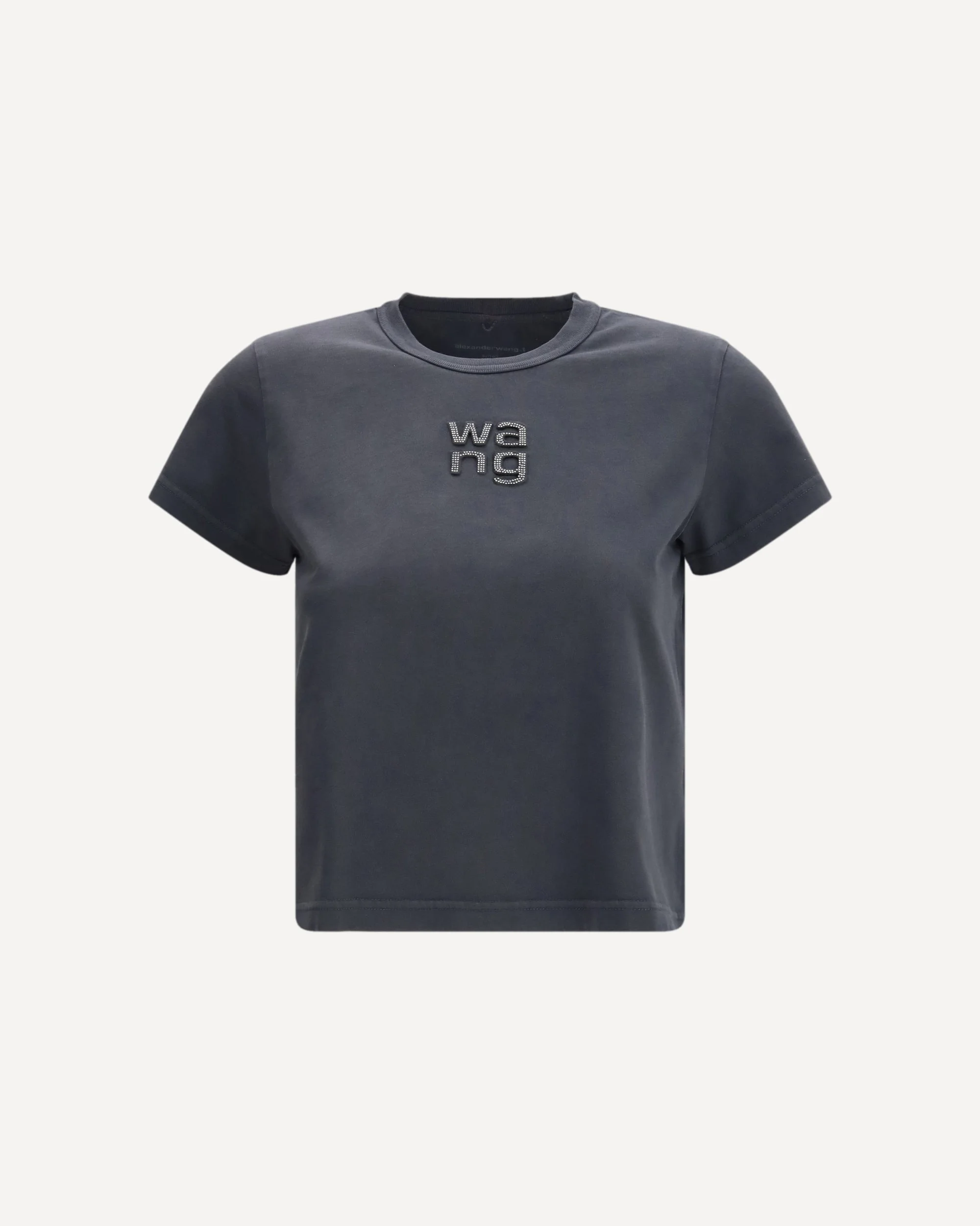 The shrunken-effect jersey T-shirt by Alexander Wang blends minimalism with a bold, modern attitude. Crafted from organic cotton, it offers a close, structured fit enhanced by a ribbed crewneck. The raised “WANG” logo at the center, finished with tonal hotfix rhinestones, adds a subtle touch of shine that elevates the design. A piece that reflects the brand’s contemporary identity with precision and unmistakable style. DETAILS - Sku: 4CC1261221_011 - Season: SS26 - Fit: Regular - Composition: GENERAL 100% Cotton - MADE IN CHINA